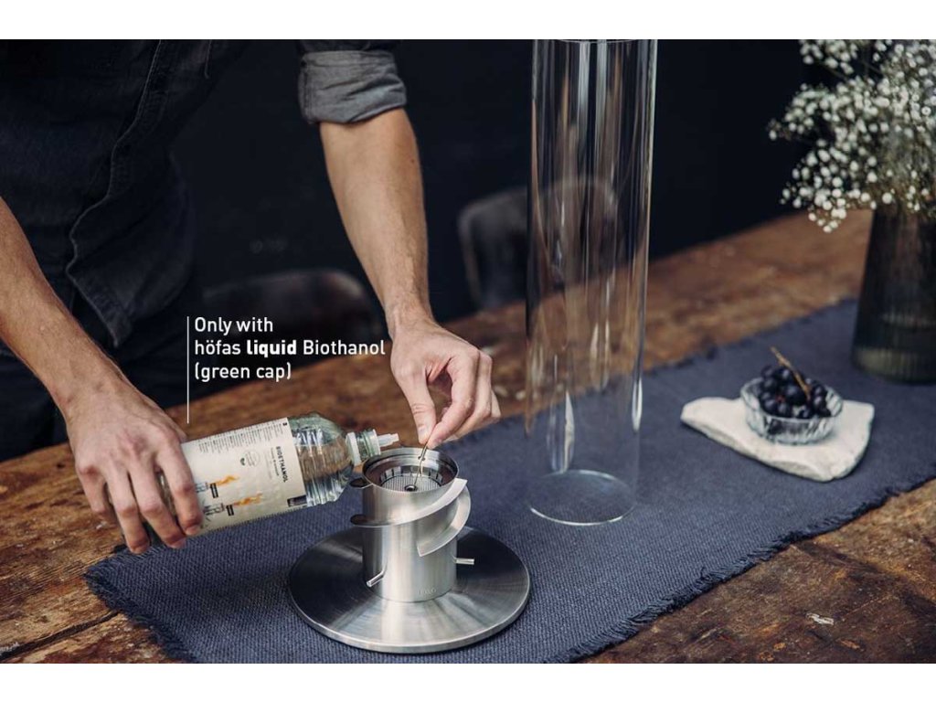 Zapálení biokrbu SPIN je velmi snadné. Palivo jednoduše nalijete do hořáku a tento stolní biokrb zapálíte. Pak jen nasadíte válec ze speciálního borosilikátového skla a užíváte si dlouhých plamenů a příjemného tepla. Pokud chcete stolní biokrb Höfats Spin zhasnout předčasně, stačí na něj položit přiložené zhášedlo. Stolní biokrb Spin vydrží hořet na jednu náplň cca 1 hod.