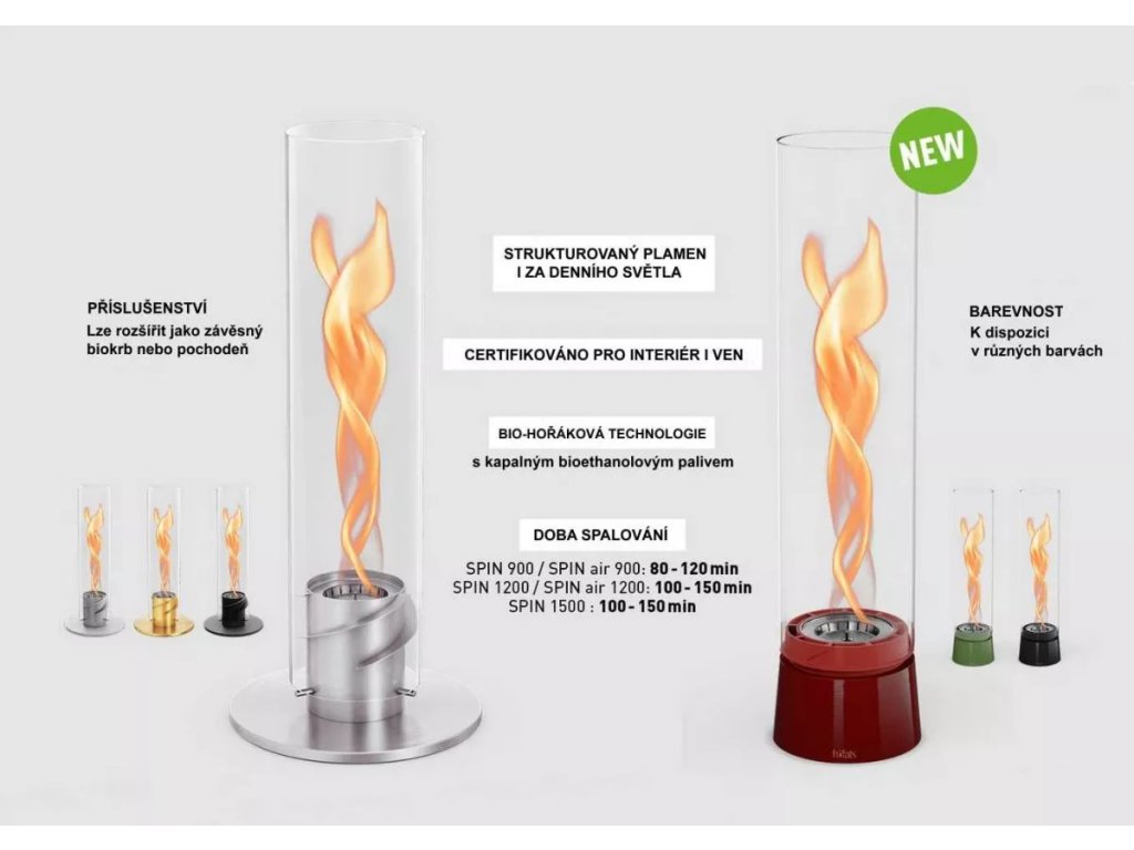 Hypnotizující hra plamenů zaujme svou výjimečnou estetikou, promyšlenou funkčností a nekompromisní bezpečností. Na bázi přírodního bioetanolu Höfats se zdánlivě jednoduchý SPIN air promění ve velkolepý, zářivý vír plamenů, jakmile je nastaven válec ze žáruvzdorného borosilikátového skla.