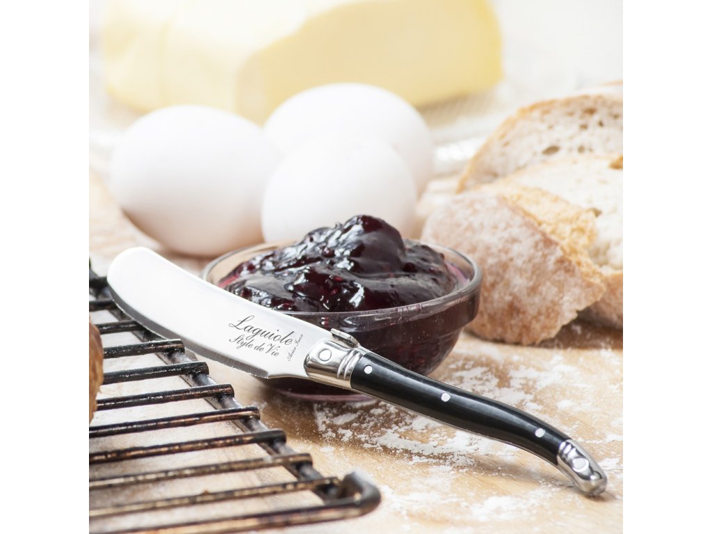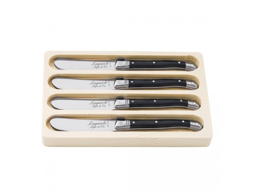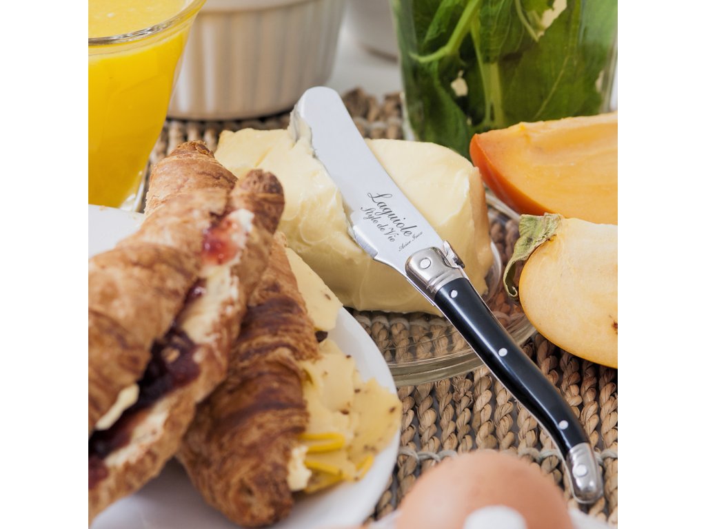 Jednoduchý a všestranný doplněk, který patří na váš prostřený stůl nejen při snídani. Nože mají díky kombinaci nerezové oceli a černé barvy elegantní vzhled, takže se tato 4dílná sada nožů na máslo bude hodit na každý prostřený stůl. Díky zaoblenému tvaru a široké čepeli jsou vhodné nejen k roztírání másla a rostlinných tuků, ale využijete je i při roztírání paštik, pomazánek a marmelád. Černá rukojeť je vyrobena z plastu (ABS) a samotná čepel z nerezové oceli, proto je možné nože mýt i v myčce, nicméně doporučujeme ruční mytí. |