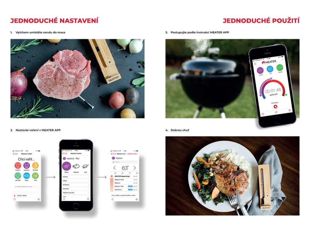 Vaření dostává novou podobu! Jak to funguje? Teploměr Meater zapíchněte do středu masa a maso dejte na gril nebo do trouby. Meater díky bluetooth technologii vysílá signál vašemu telefonu nebo tabletu a chytrá aplikace vás provádí celou přípravou. Stačí jen zvolit druh masa a úpravu. |