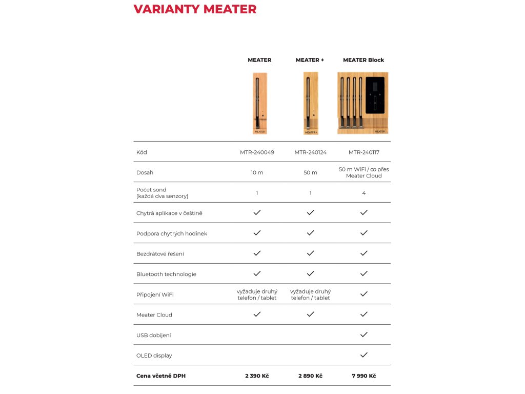 Tři varianty na výběr! 1. Základní variantou je jeden vpichový teploměr Meater s dosahem 10 m - tedy použití běžné domácí. 2. Střední varianta je jeden vpichový teploměr Meater s dosahem 50 m - tedy použití i venku nebo když třeba doma pečete dlouho maso a chcete jít k sousedce na skleničku. 3. Nejvyšší varianta celkem 4 vpichové teploměry Meater s dosahem 50 m a neomezeně přes Meater Cloud - úžasná věc když máte pečící troubu se sepnutím v určitý čas, vaše maso je hotové než přijedete domů. |