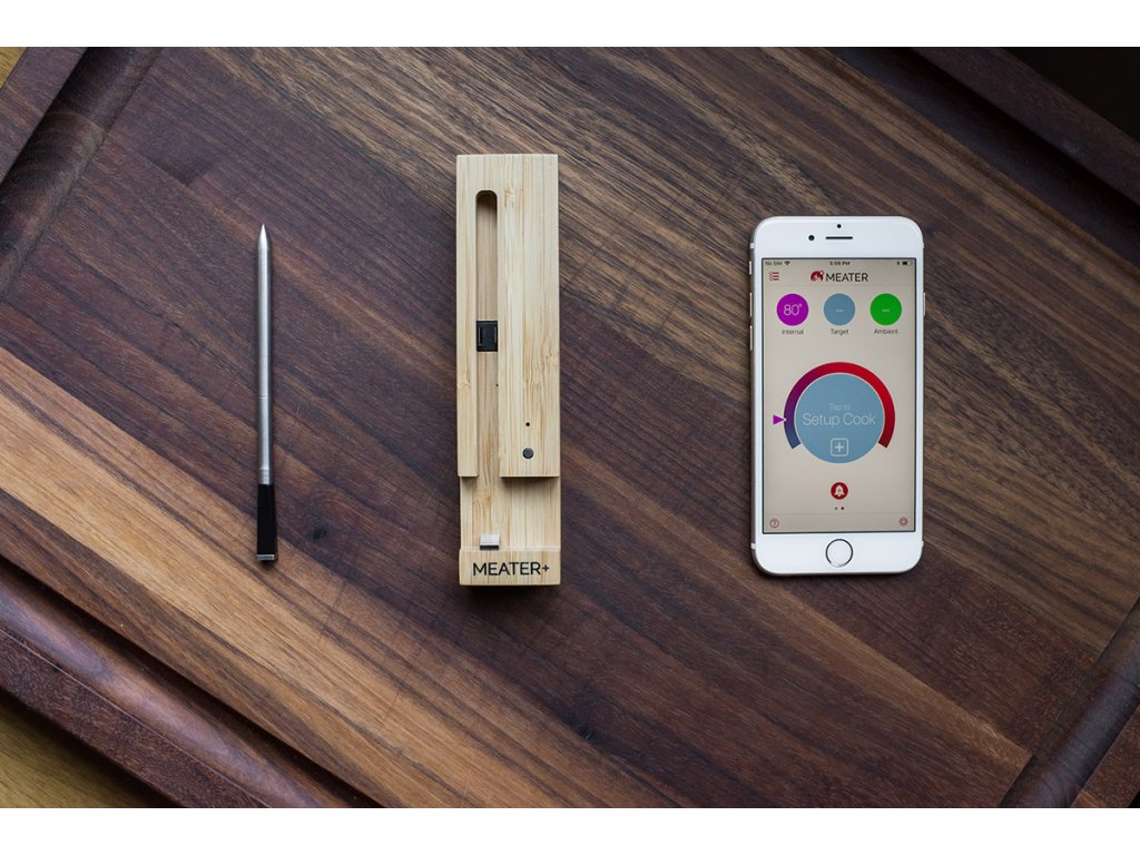Vaření dostává novou podobu! Jak to funguje? Teploměr Meater zapíchněte do středu masa a maso dejte na gril nebo do trouby. Meater díky bluetooth technologii vysílá signál vašemu telefonu nebo tabletu a chytrá aplikace vás provádí celou přípravou. Stačí jen zvolit druh masa a úpravu. |